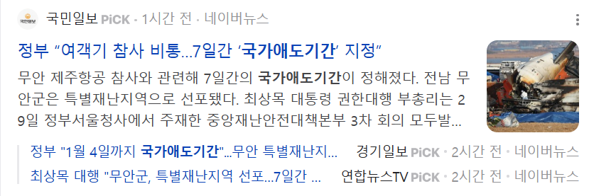 [4] 동아일보 - [속보]정부, 1월 4일까지 7일 간 국가애도기간 지정 (https://www.donga.com/news/Society/article/all/20241229/130748003/1)
