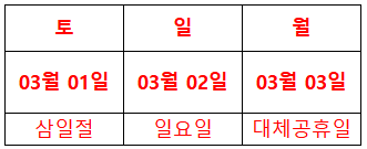 2) 삼일절 : 3월 1일(토) ~ 3월 3일(월)