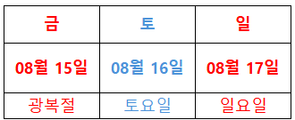 5) 광복절 : 8월 15일(금) ~ 8월 17일(일)