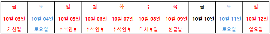 6) 개천절, 추석 연휴, 한글날 : 10월 3일(금) ~ 10월 12일(수)