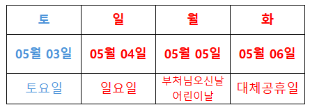 3) 부처님 오신 날, 어린이날 : 5월 3일(토) ~ 5월 6일(화)
