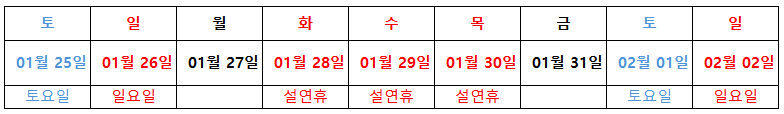 1) 설날 연휴 : 1월 28일(화) ~ 30일(목) : 최대 9일(연차2일사용시)