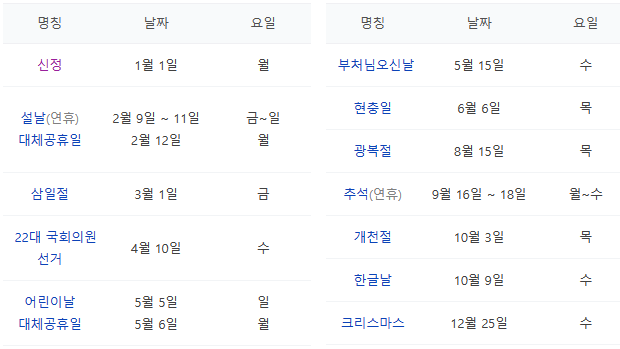 아래 표는 공휴일 연휴 대체공휴일을 순서대로 정리해 보았습니다.