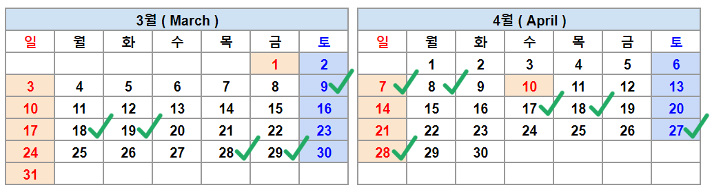 3월 9일, 18일, 19일, 28일, 29일 4월 7일, 8일, 17일, 18일, 27일, 28일