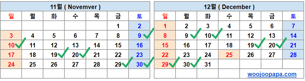 11월 9일, 10일, 19일, 20일, 29일, 30일 12월 9일 10일, 19일, 20일, 29일, 30일