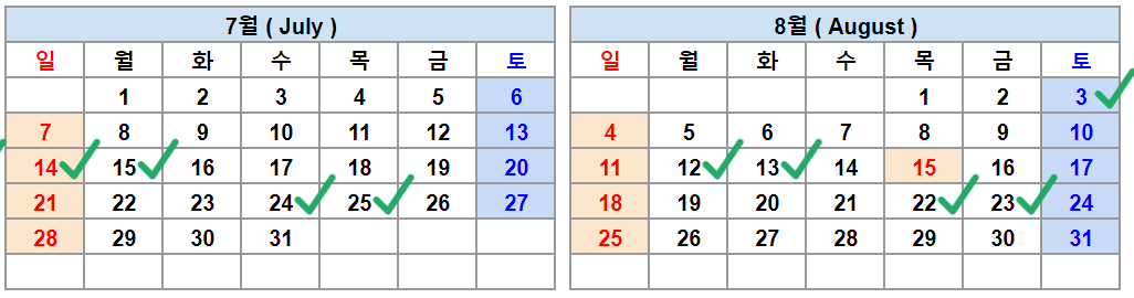 7월 14일, 15일, 24일, 25일 8월 3일, 12일, 13일, 22일 , 23일