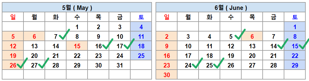 5월 7일, 16일, 17일, 26일, 27일 6월 5일, 14일, 15일, 24일, 25일