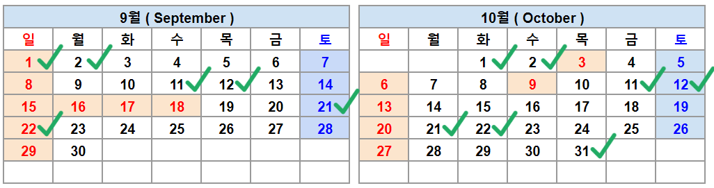 9월 1일, 2일, 11일, 12일, 21일, 22일 10일 1일, 2일, 11일, 12일, 21일, 22일, 31일