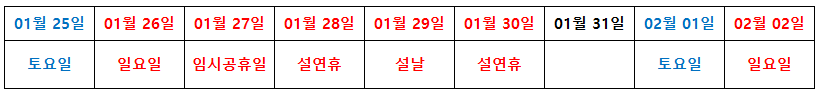 [4] 조선일보 - 1월 27일 임시 공휴일 지정... 설 명절 6일 쉰다 (https://www.chosun.com/economy/economy_general/2025/01/08/VPO4WWDHYFCU7ES4EMG2TLNLDM/)