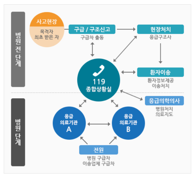 [4] E-GEN - 응급의료체계-구성요소 | E-GEN통합홈페이지 (https://www.e-gen.or.kr/nemc/emergency_medical_services_system.do?viewPage=structural_elements)