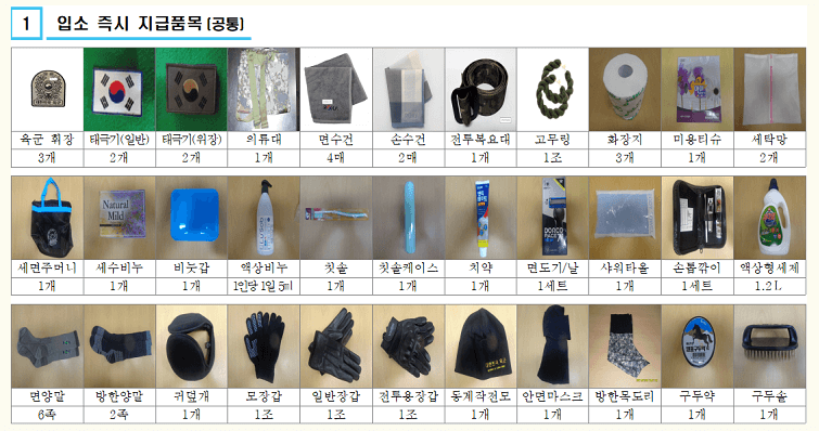 군대에 입대하면 지급하는 품목들을 확인하여 선물이 보급품과 중복되지 않도록 확인해 보겠습니다.