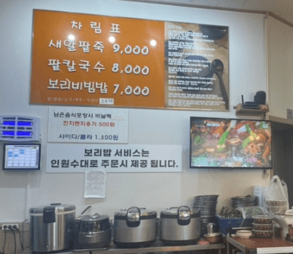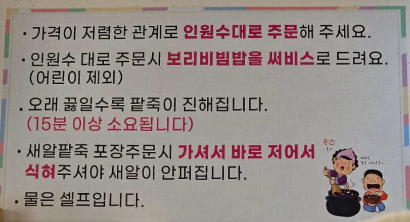 이곳의 메뉴는 새알팥죽, 팥칼국수, 보리비빔밥으로 구성되어 있으며,