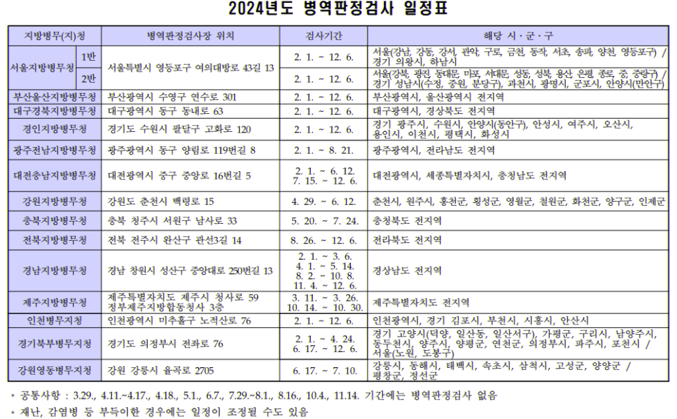 ※ 다만, 아래 지역에 거주하는 사람 중 관할 지방병무청 병역판정검사가 없는 기간에 검사를 희망하는 경우 가까운 지방병무(지)청으로 선택 가능합니다.