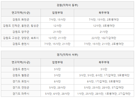 연고지복무병 복무부대(강원 또는 경기일원 예전 1,3군 관할 예하 19개 부대)