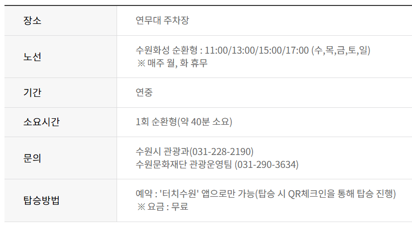 버스는 약 40분간 운행되며, 수원 화성의 주요 명소들을 지나갑니다.
