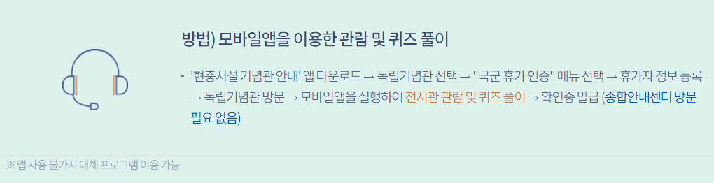 휴가 중 독립기념관 전시관람 안내책자 또는 모바일앱을 통한 관람 후 확인증 수령하여 소속 부대 전달하면