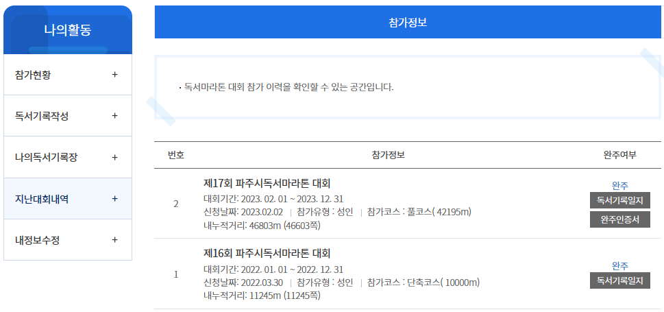 '파주시독서마라톤 대회'에 2년 연속 참여하여