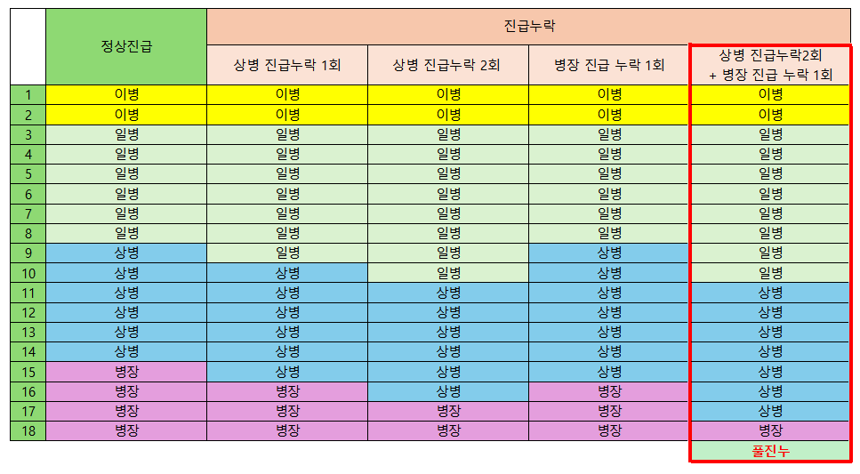 일병→상병(최대 2개월), 상병→병장(최대 1개월)까지 총 3개월을 전부 진급누락하면 '풀진누'라고 합니다.