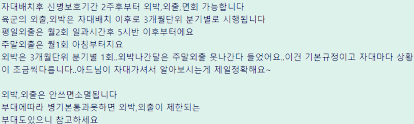 • 외박 기간 : 외박은 주말이나 공휴일을 포함하여 시행될 수 있습니다.
