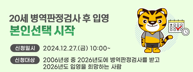 ‘20세 병역판정검사 후 입영’제도 신설에 따라, 2025년도 병역판정검사 대상자(2006년생) 중 2026년도 입영을 희망하는 사람은 2026년도 병역판정검사 희망월과 입영 희망월을 사전 신청할 수 있습니다.
