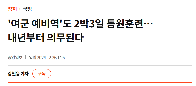[1] 중앙일보 - '여군 예비역'도 2박3일 동원훈련… 내년부터 의무된다