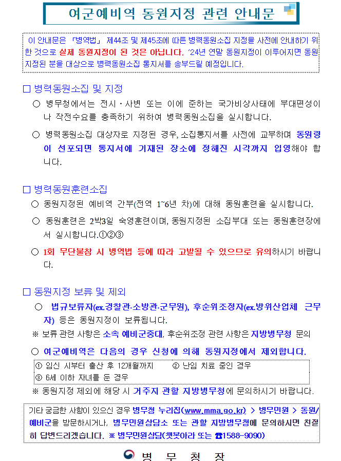 [3] 병무청 - 2025년 여군예비역 병력동원소집 지정 안내|공지사항